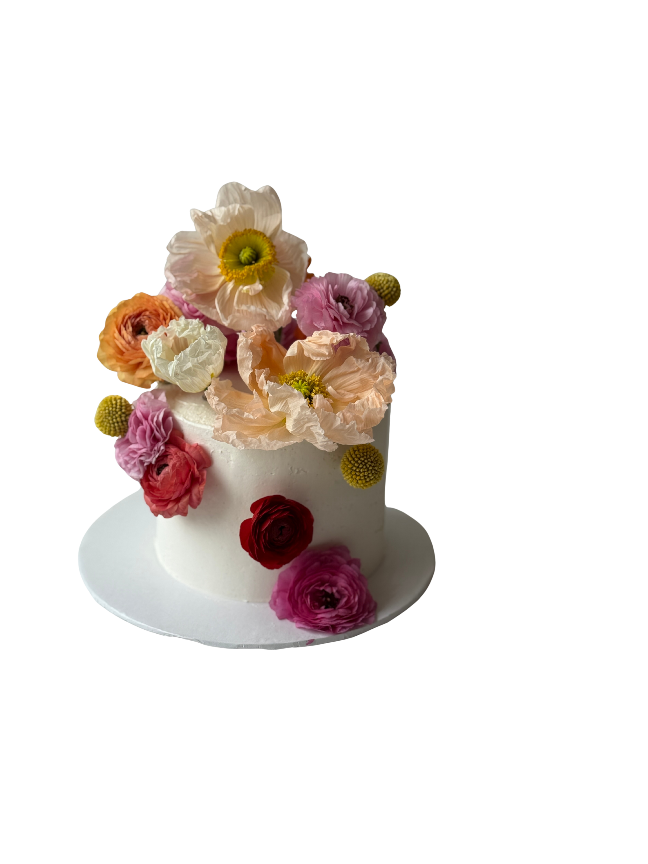 rainbow confetti cake, whipped vanilla buttercream, luxe florals, premium packaging and a blank note card.